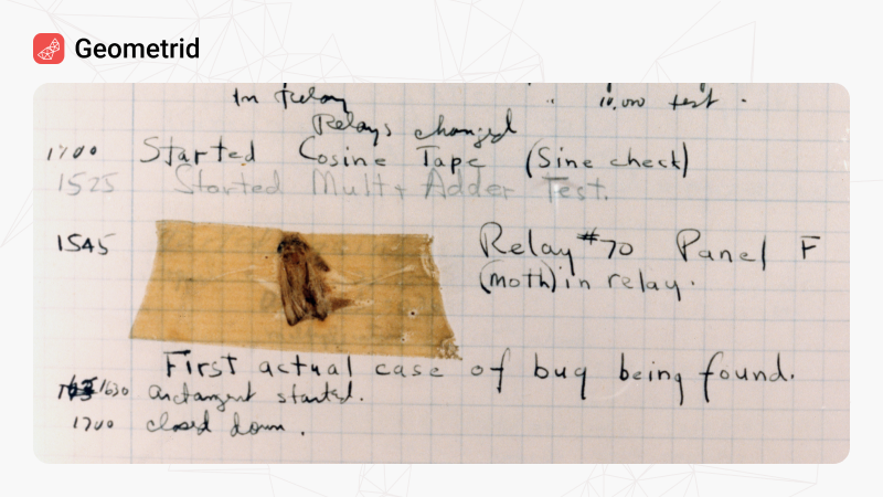 A team of engineers working on the Mark II computer found a moth wedged into Relay #70, Panel F. It was causing the system to malfunction. They extracted it, taped it into the log book, and wrote: "First actual case of a bug being found."